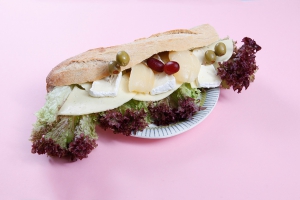 Port Salutost, brie, inlagda päron, sallad, gröna oliver och vindruvor. En rejält tilltagen surdegsbaguette. Brödet innehåller inte ägg och inte mjölk. Smörgåsmargarinet är vegetabiliskt. Brieosten är pastöriserad.