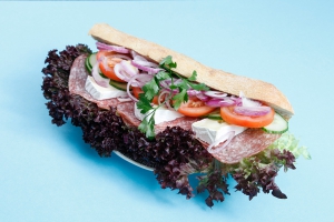 Brie, salami, sallad, gurka, tomat och rödlöksringar. En rejält tilltagen surdegsbaguett. Brödet innehåller inte ägg och inte mjölk. Smörgåsmargarinet är vegetabiliskt. Brieosten är pastöriserad.